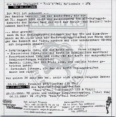 Jahr: 2002 Diese CD wurde zum Anlass der Promotion des Albums "Unplugged - Rock'n'Roll Realschule" an TV Stationen/Zeitungen u.ä. verschickt. Die CD ist eine CD-ROM, aber trotzdem ein offizieller Promo-Artikel. Sie beinhaltet Song Snippets (5 Songs, s.u.), Pressefotos, Pressekonferenz im Albert Schweizer Gymnasium (exklusiv auf dieser CD-ROM), Band Biographie/ Presse Texte und einen Covershot. Die CD ist extrem rar. Hier könnt ihr noch ein Blick auf die Rückseite und die CD werfen. biedä |