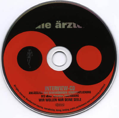 Jahr: 1999 Diese CD erschien ohne Booklet und beinhaltet ein Interview von Markus Karg mit die ärzte, dass an Radiostationen u.ä. verschickt wurde zur Veröffentlichung des zweiten die ärzte Live-Albums "Wir wollen nur deine Seele". Das Interview wurde in 2 Teilen auch im "Spacken", dem Fanzine des "die ärzte" Fanclubs abgedruckt. |