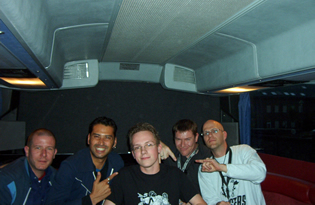 Düsseldorf, 1. Oktober 2002. Vor dem Gig des Farin Urlaub Racing Teams im Tor 3 standen mir die besten Bläser der Welt Quitte, Robert, Hardy und Fischi von den Busters im Nightliner des Racing Teams Rede und Antwort. Es wurde einiges an Killepitsch und Bier getrunken - eben eine heitere Gesprächsrunde.